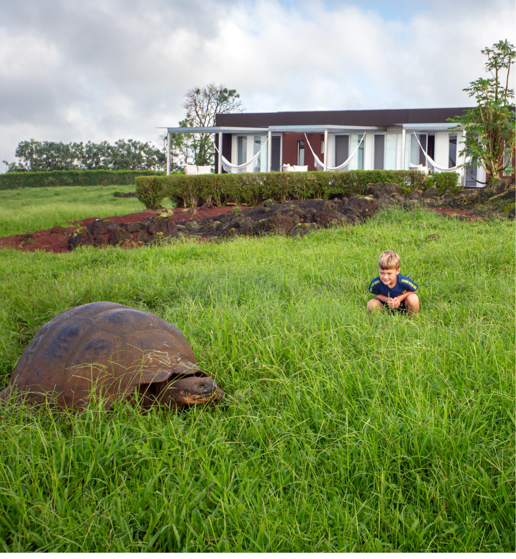 A family on the grass field in front of Villa Tortuga observing a giant Tortoise passing by. Natural preservation of the habitat