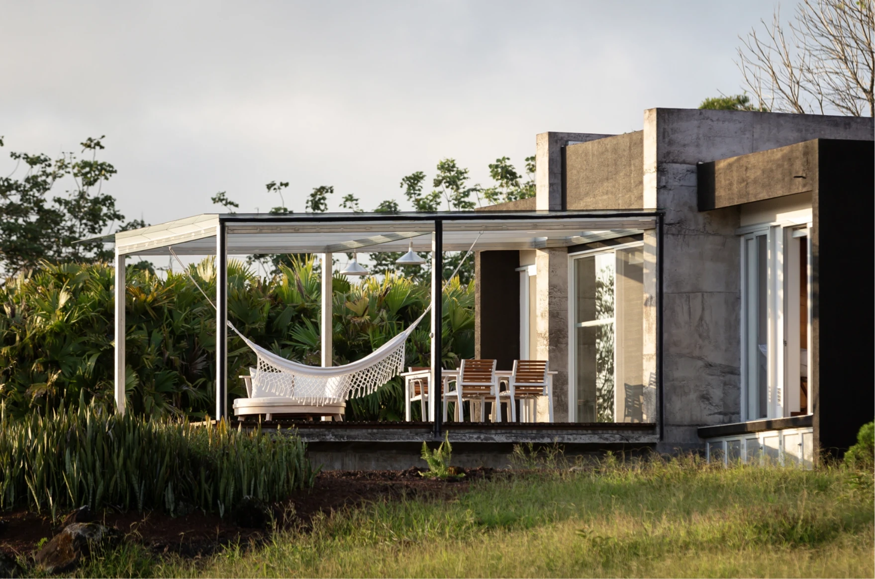 Villa Lechuza, view of the outside deck, garden, green field and trees in the background, two guests